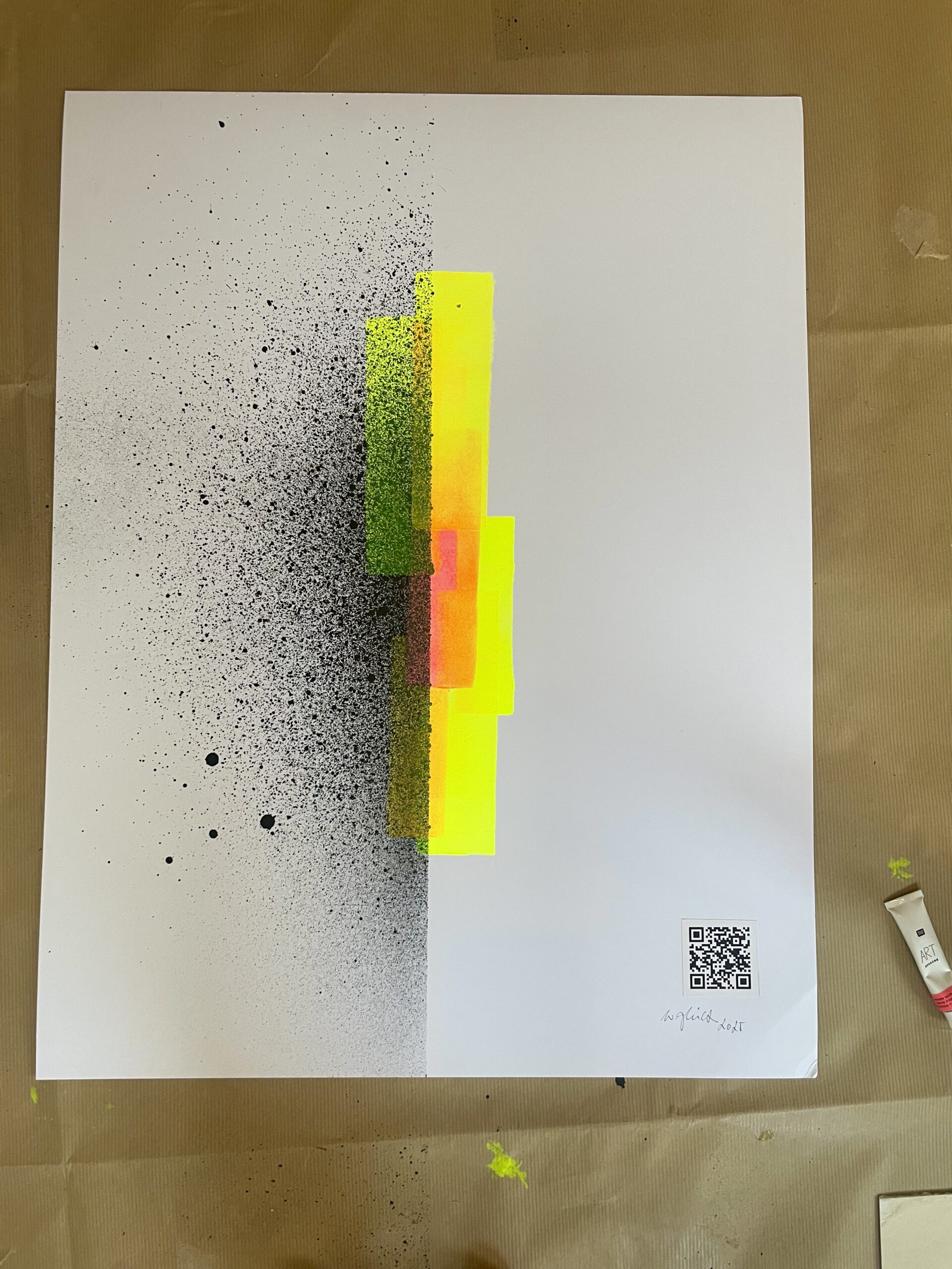 Von der Natur inspiriert. Mit elektronischer Musik gemalt. So entstehen Neonblinks. Einzigartiges Kunst-Geschenk: Jedes Bild ein Original. Tiefschwarz mit amorphen Elementen, dynamischen Neonfarben und Goldprägung. Playlist auf Wunsch verfügbar 🖤